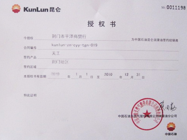 昆侖潤(rùn)滑油授權(quán)書(shū)